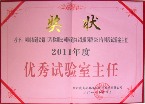 我公司国道317线俄岗路GS1监理试验室在业主组织的2011年度年终考核评比中,分别荣誉优秀试验室和优秀试验室主任称号。